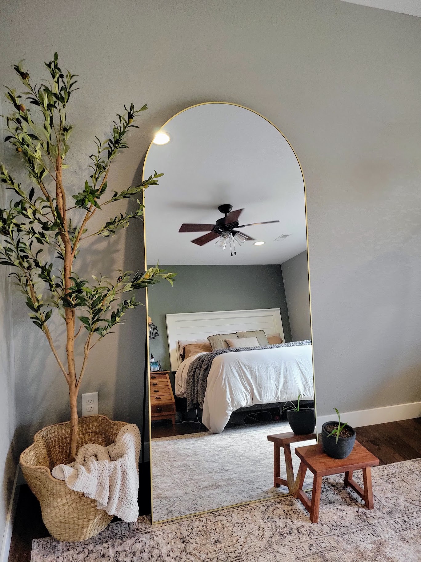 Budget played a key role, so we got creative with repurposing and sourcing. A large rectangular mirror originally in the master bedroom found new life in the entryway, and high-quality pieces at accessible price points were layered with locally sourced accents to add personality and charm.